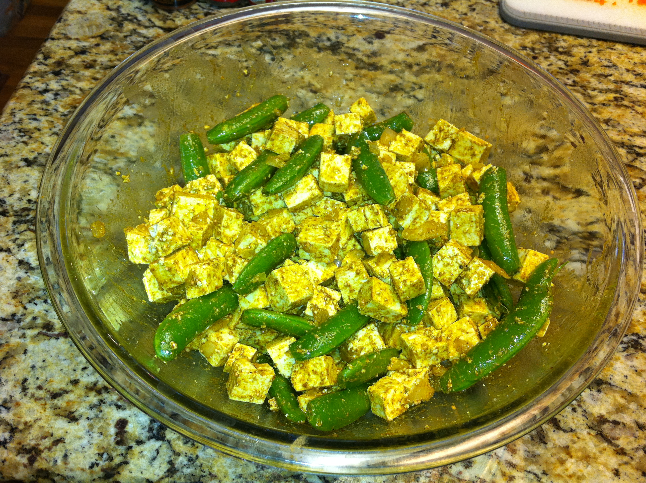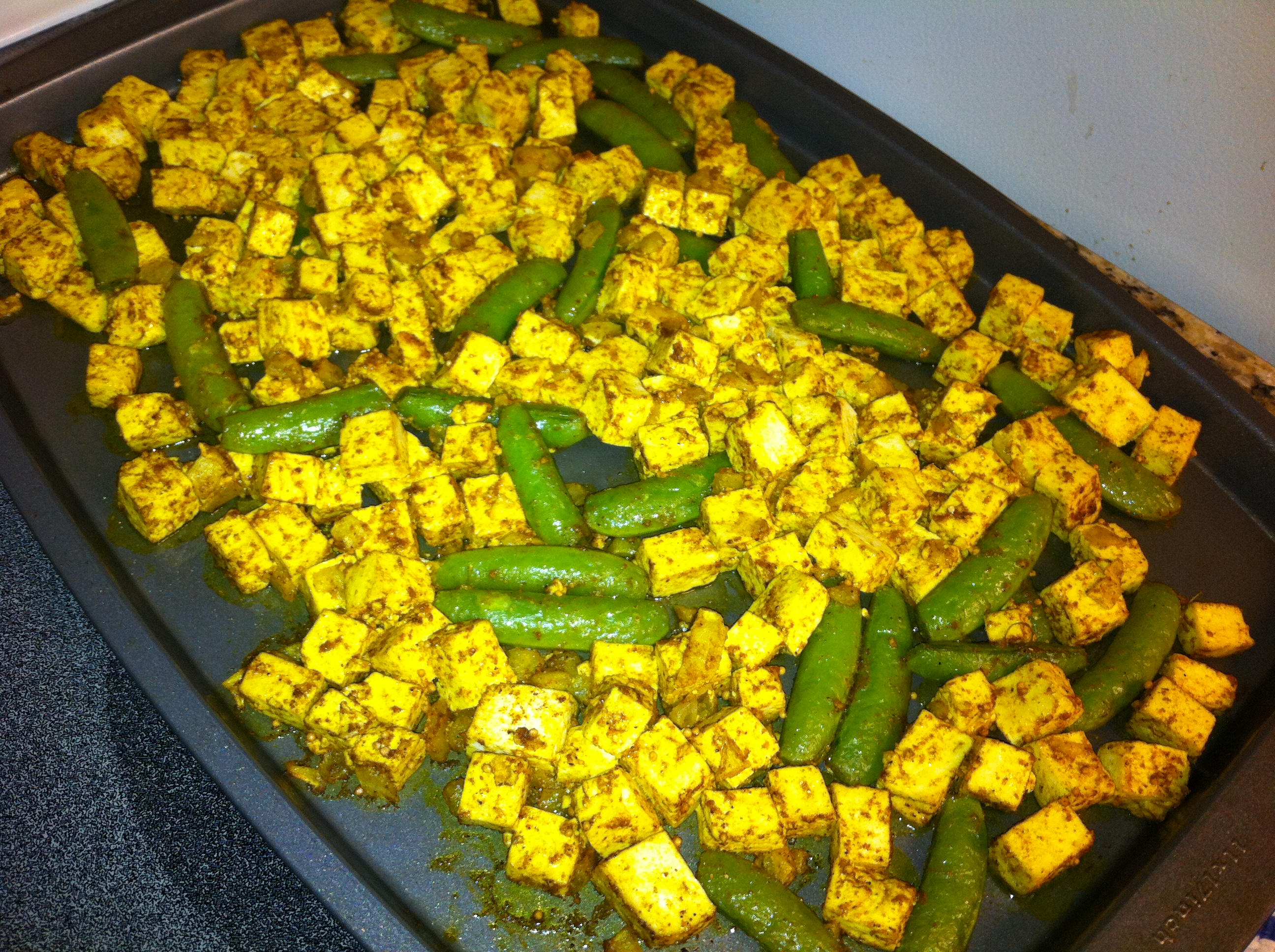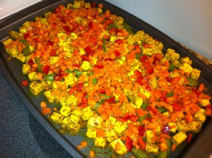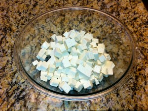 Spray a cookie sheet with non-stick spray and spread the tofu evenly. Bake at 350 degrees for 20 minutes.