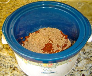 Place spice mixture at bottom of crockpot and add remaining ingredients starting with the lentils. Add lentils, carrots, celery, diced tomatoes and water.