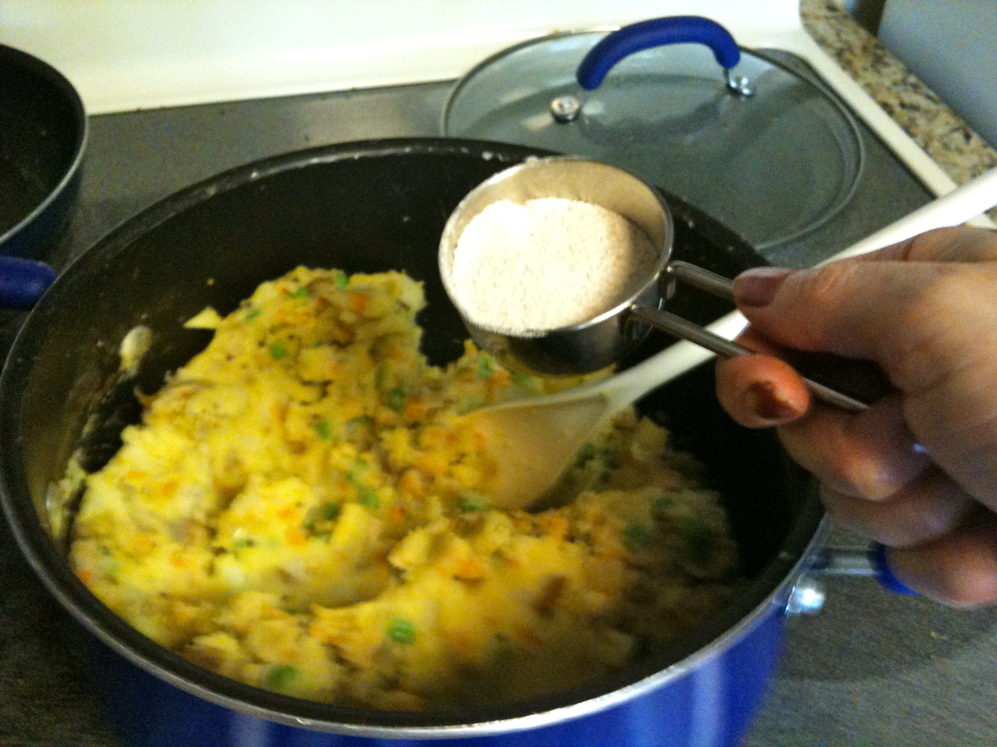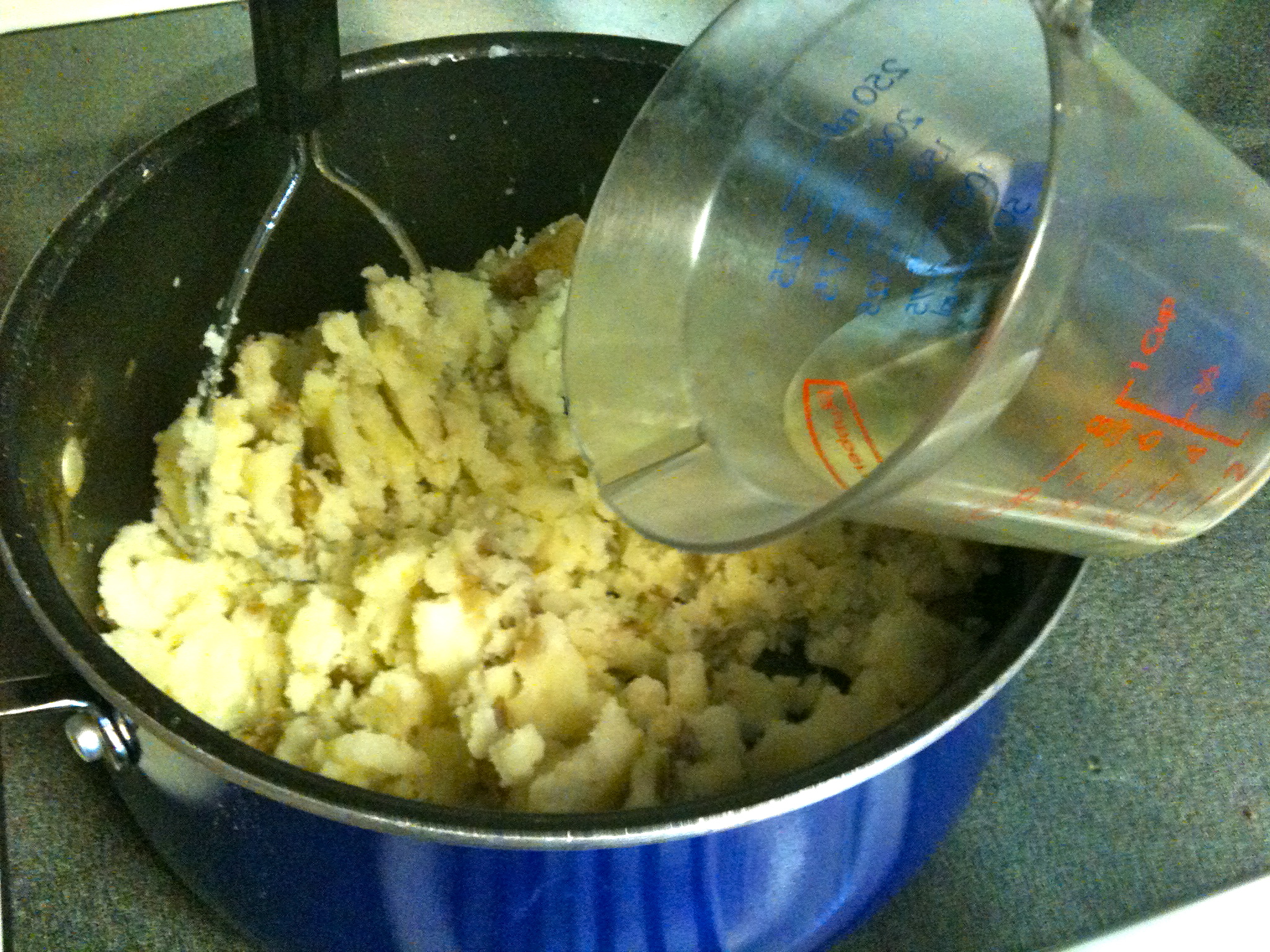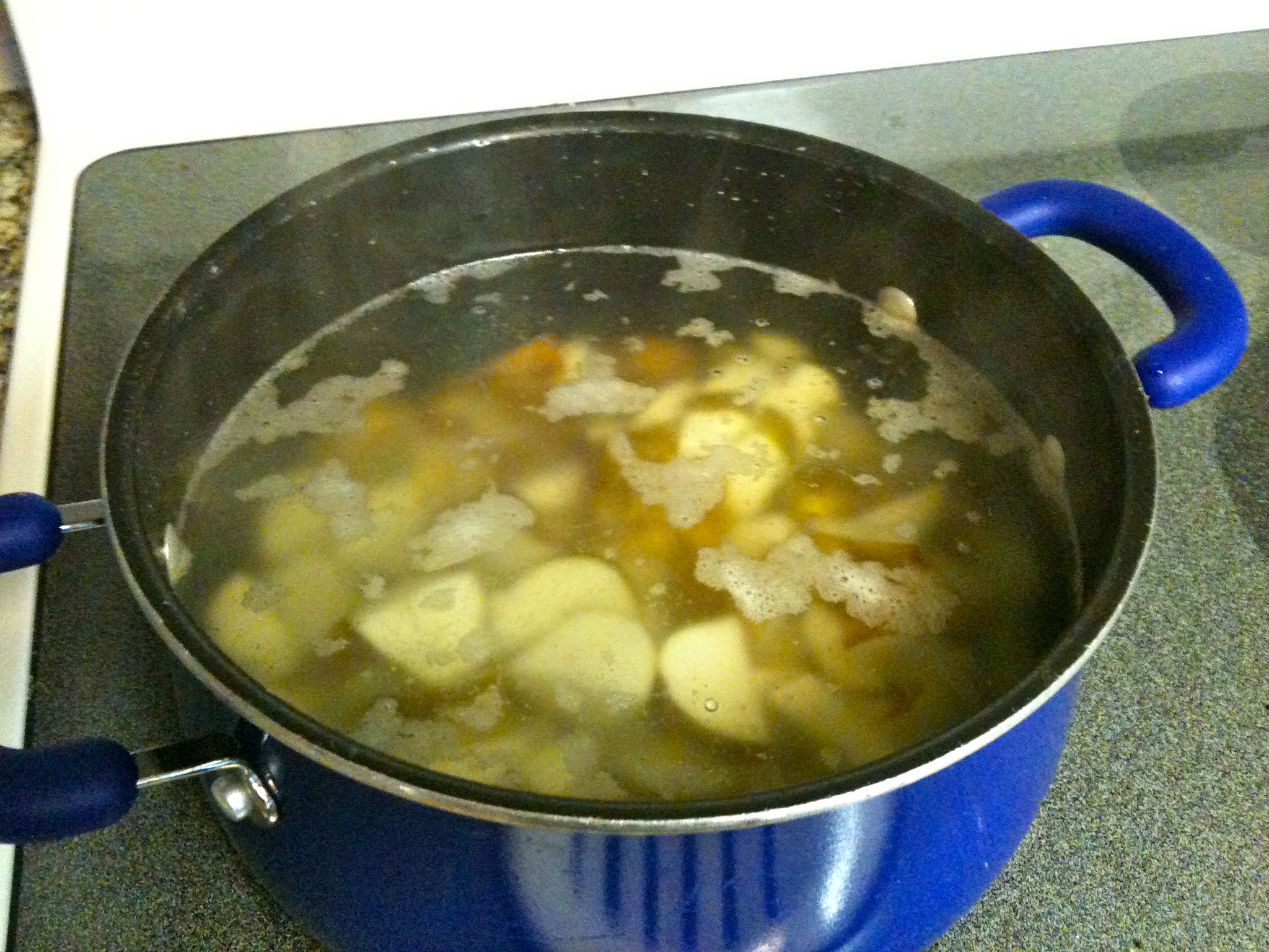 Place potatoes in a pot of water and bring to a boil. Then let simmer for 20 minutes or until potatoes are soft. I left the skins on my potatoes in order to keep those nutrients, and they turned out just fine.