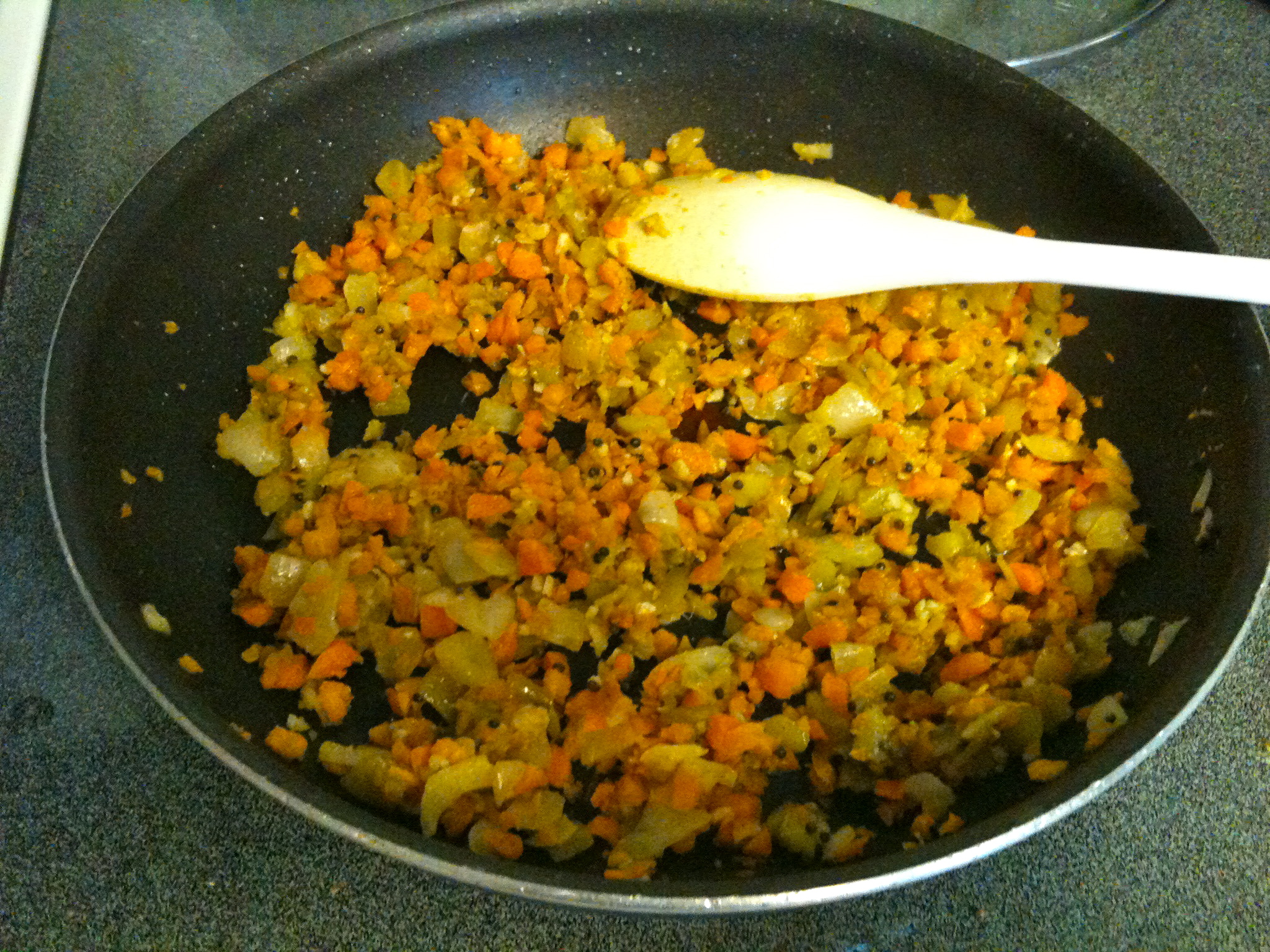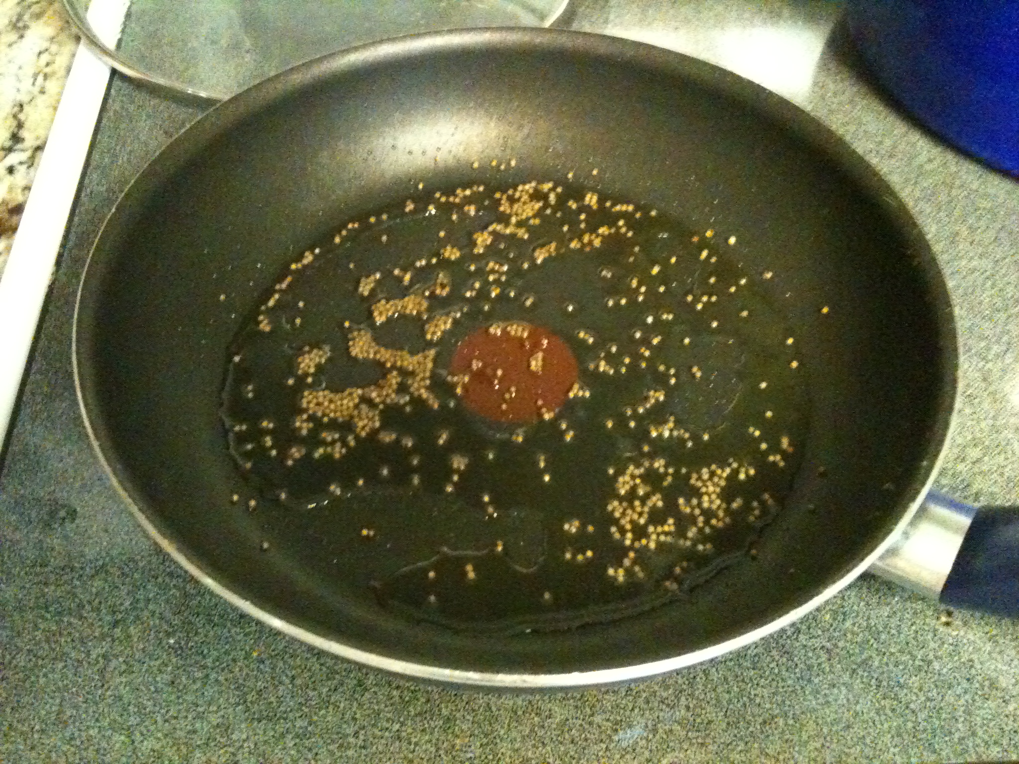 Place 2 tbsp of canola oil in large frying pan with mustard seeds on medium heat. Cover with a lid until the mustard seeds have popped--about a minute.