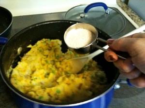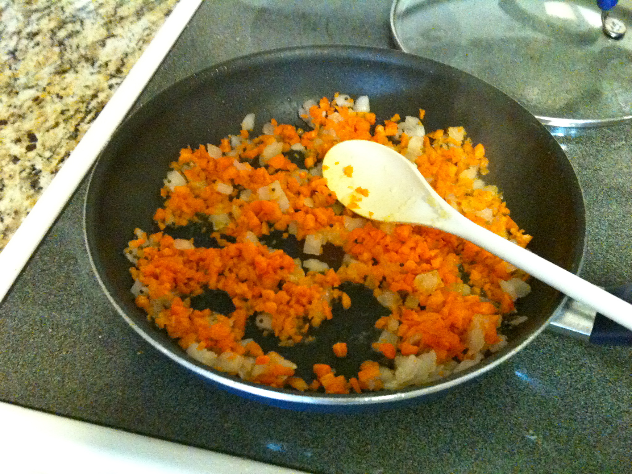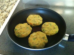 Once the batter is completely cooled, form into patties and fry in a little canola oil. I made a ball a little larger than a golf ball and then flatted it like a burger. Then as I was cooking them I pressed them down a little flatter.