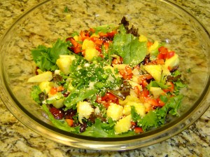 - Tagged: cilantro, dried cherries, green onion, mandarin oranges, mixed greens, pineapple, red bell pepper, salad, spring mix