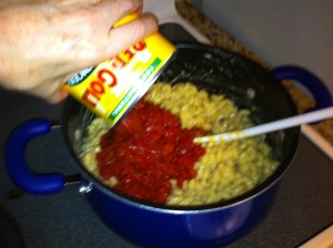 Stir in macaroni, then add canned diced tomatoes. Be sure to check every can in the store to find one with very little sodium.