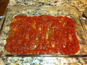 Preheat oven to 350 degrees. Spray a 9 x 13 inch pan with non-stick spray. Spread marinara sauce over bottom of pan.