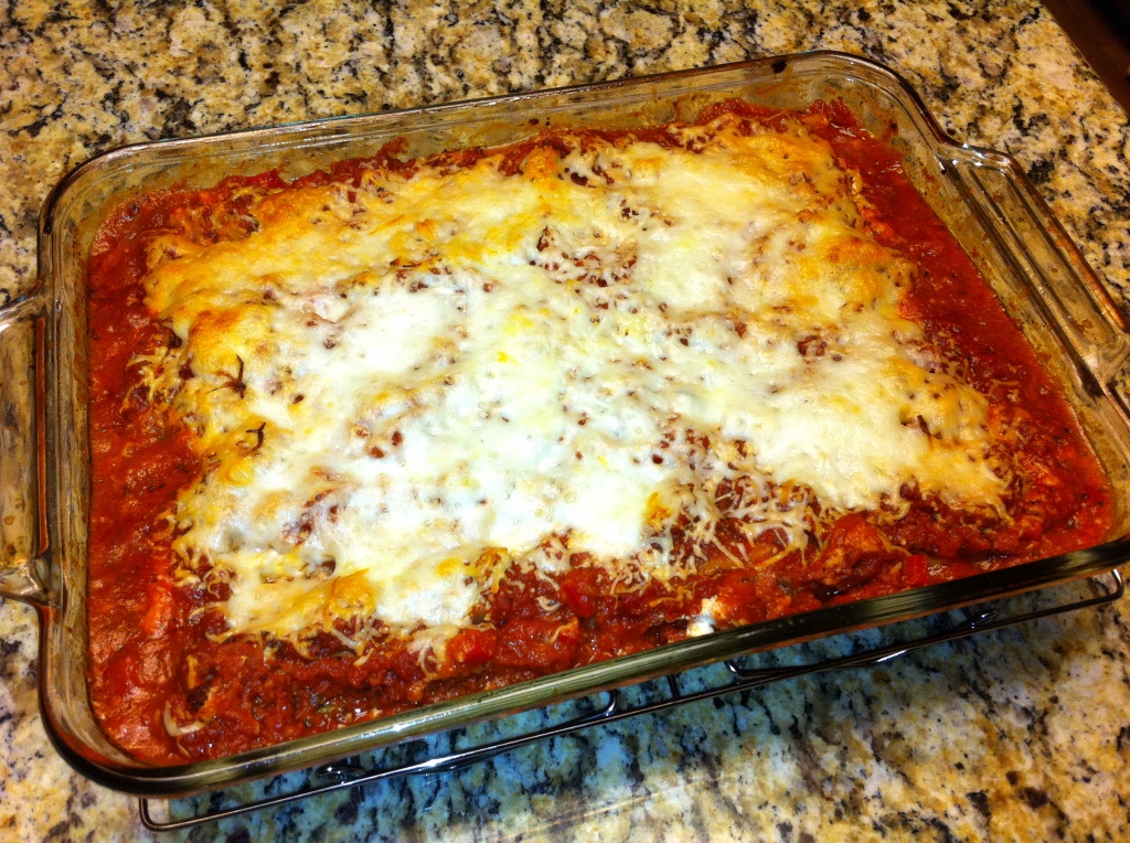 Place a final layer of noodles followed by sauce and mozzarella cheese. Spray a piece of tin foil with non-stick spray Place the tinfoil over the pan and bake for 45 minutes. Remove foil and cook for an additional 15 minutes.