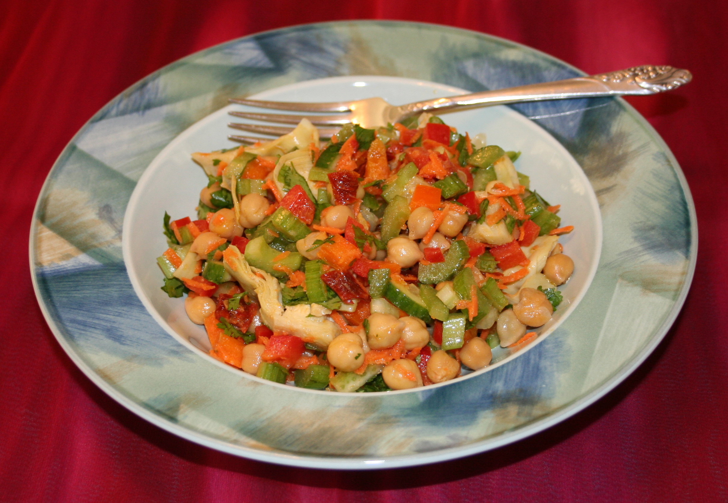 This recipe was adapted from a Canadian Living recipe and is really delicious as a full meal. It makes about 6 servings. The original recipe called for marinated artichokes but we used regular canned artichokes. We also used dry sun dried tomatoes from the bulk food store so they weren’t marinated in oil.