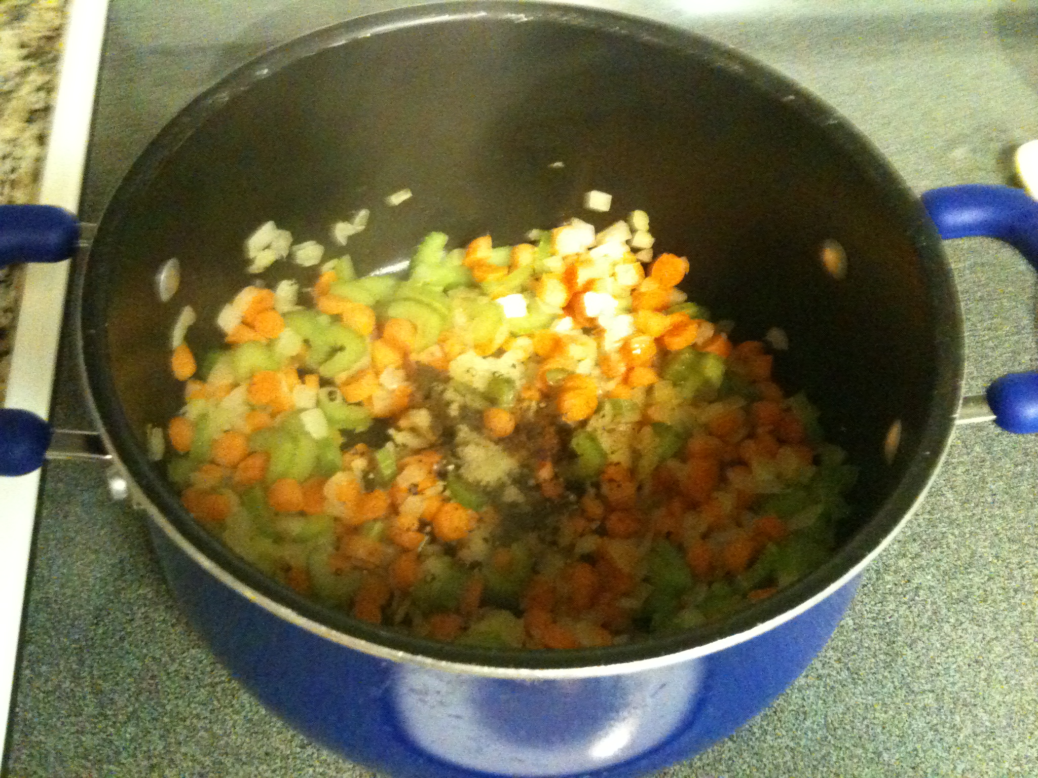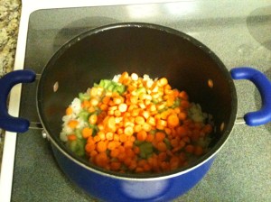 In a large pot cook onions, celery and carrots in oil from about 7 minutes or until vegetables are softened.