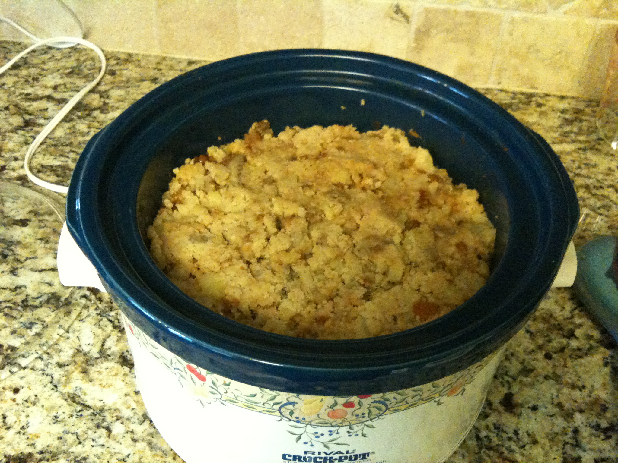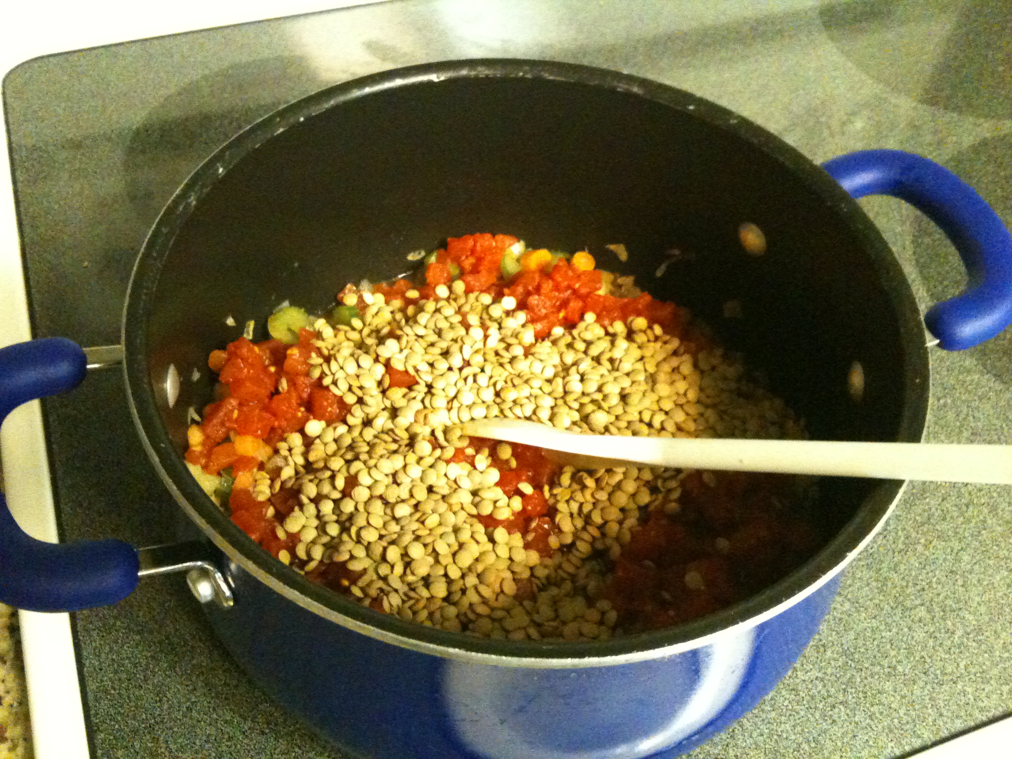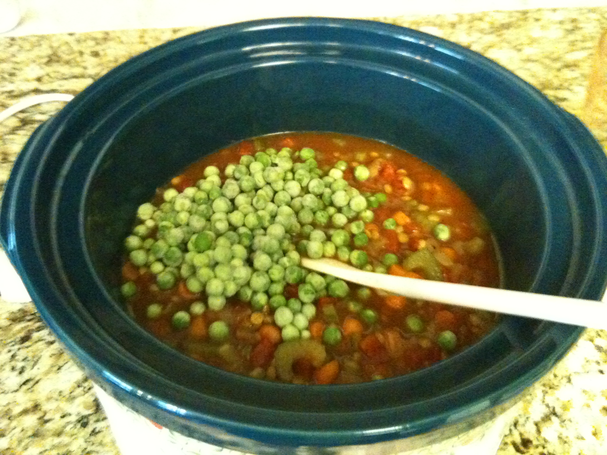 Transfer to crockpot and add vegetable broth, water, corn and peas. Stir together, cover, and cook for 3-6 hours or until lentils are tender. I cooked mine for 6 hours on high but I think my crockpot may not be typical of all crockpots. The original recipe called for 3 hours on low or 6 hours on high.