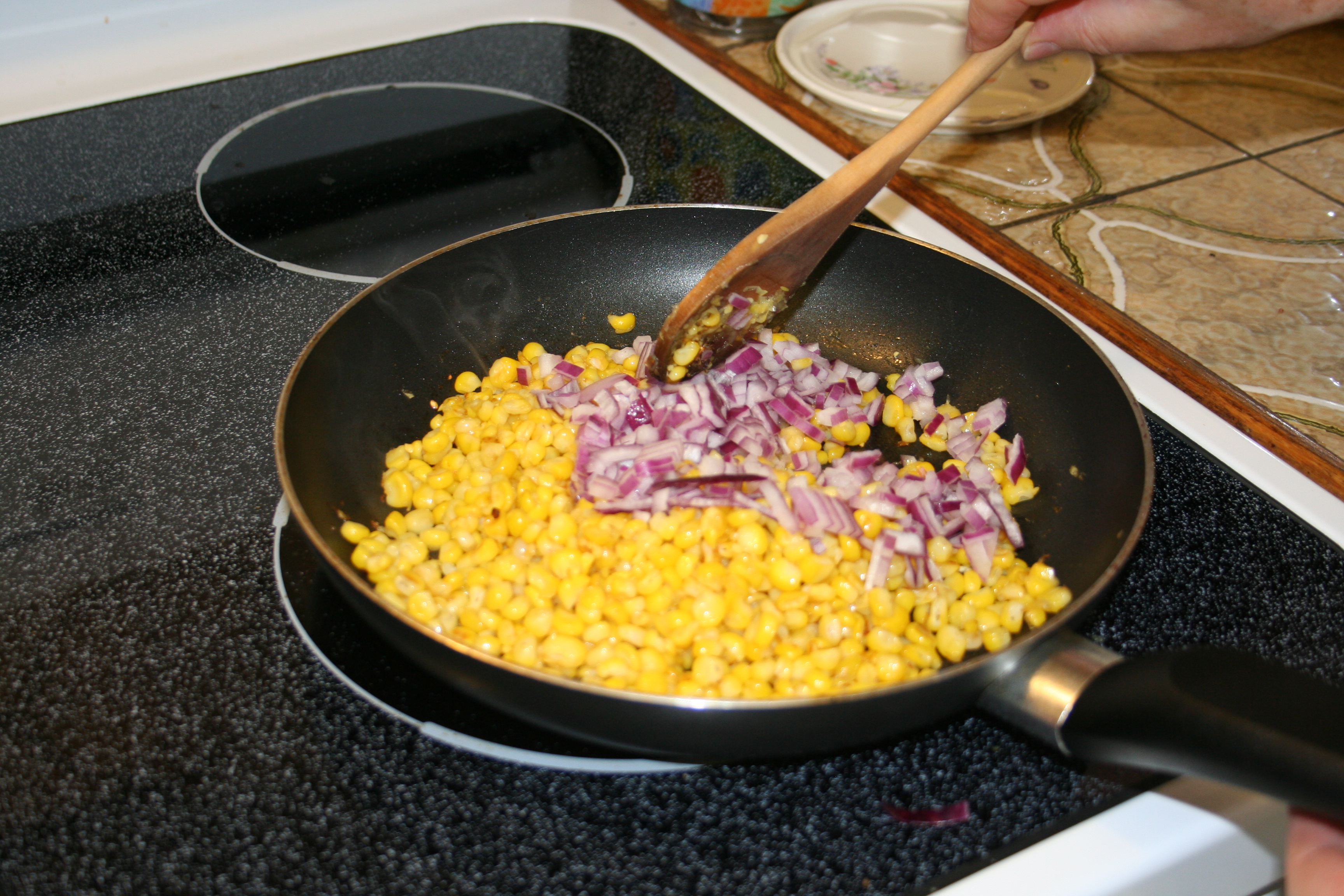 Cook corn in olive oil on medium heat for about 4 minutes or until it begins to char. Then add onion, cumin and taco seasoning.Cook for another minute or so.