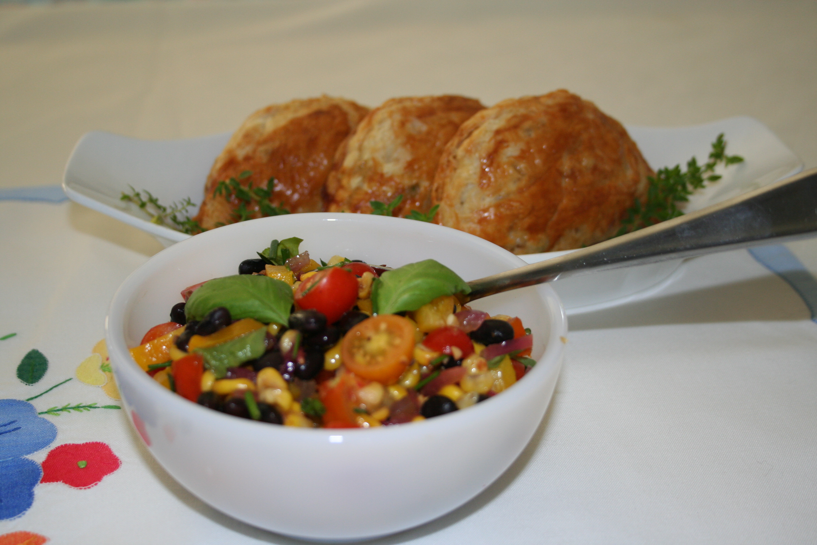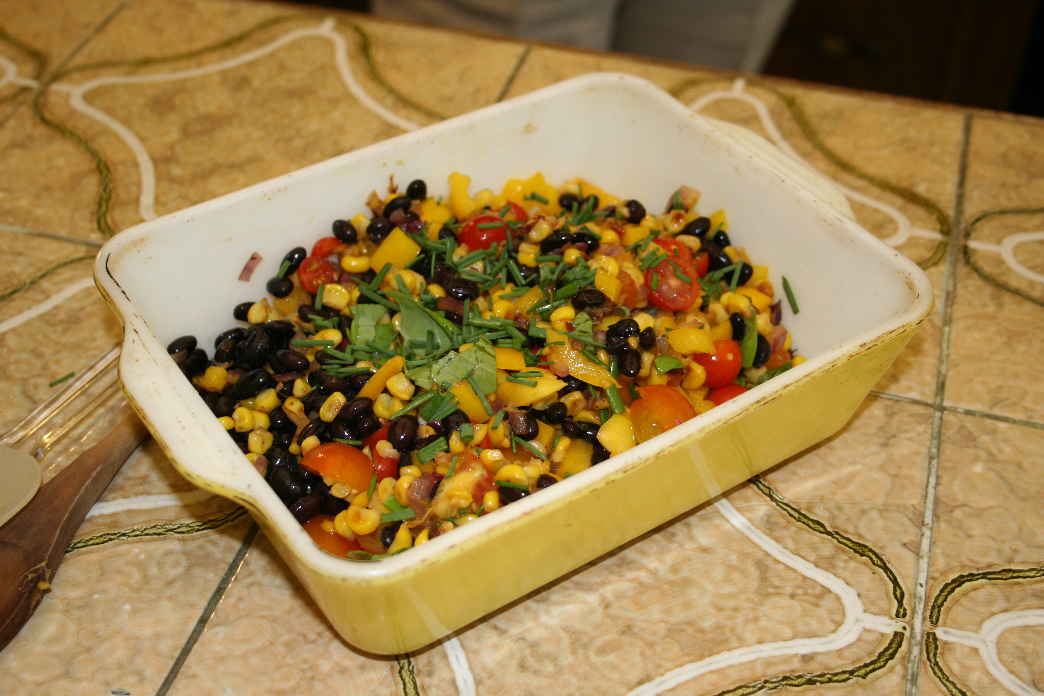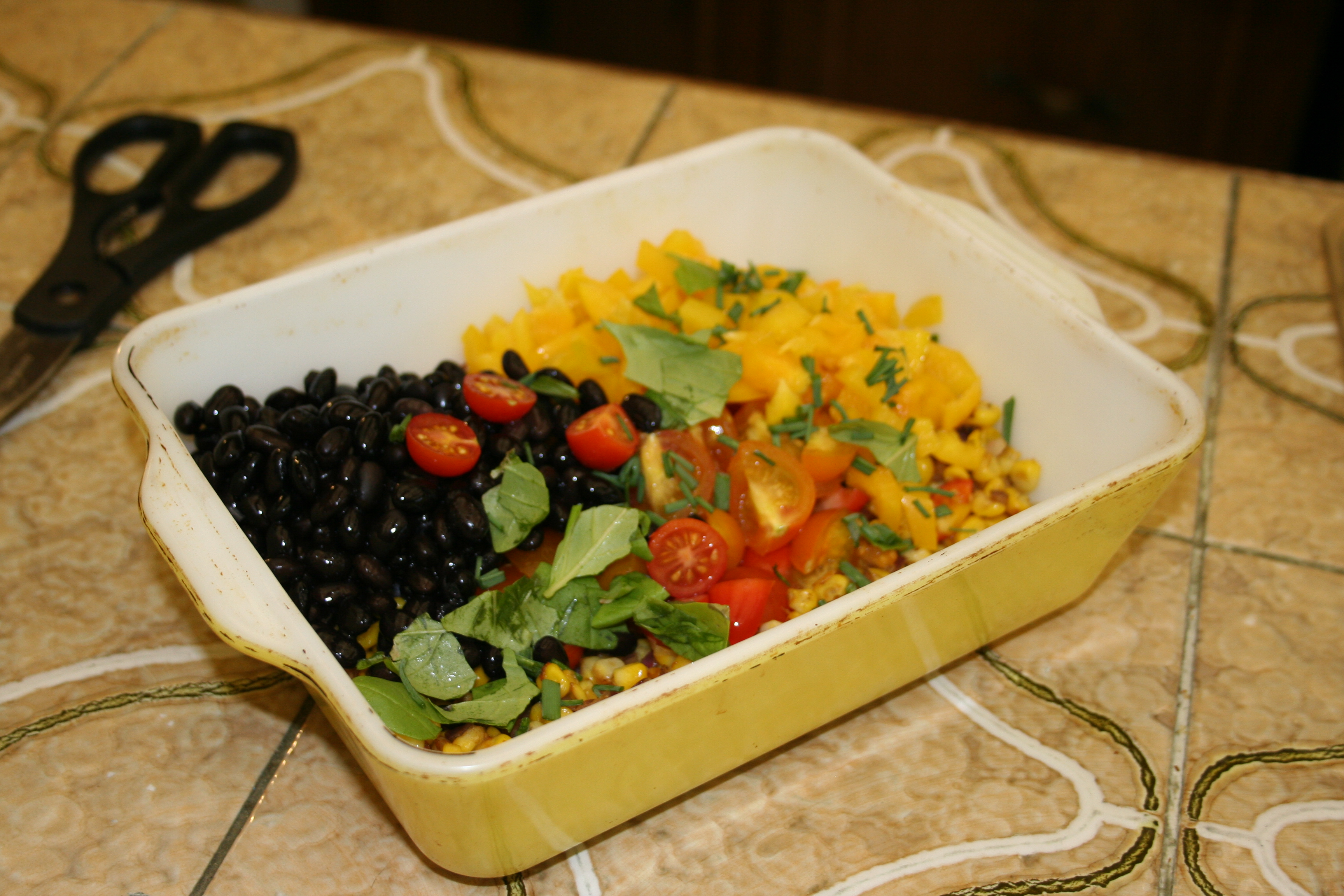 - Tagged: basil, bean, black beans, chives, corn, dinner, food, grape tomatoes, salad, texas-style, vegetarian, yellow bell pepper