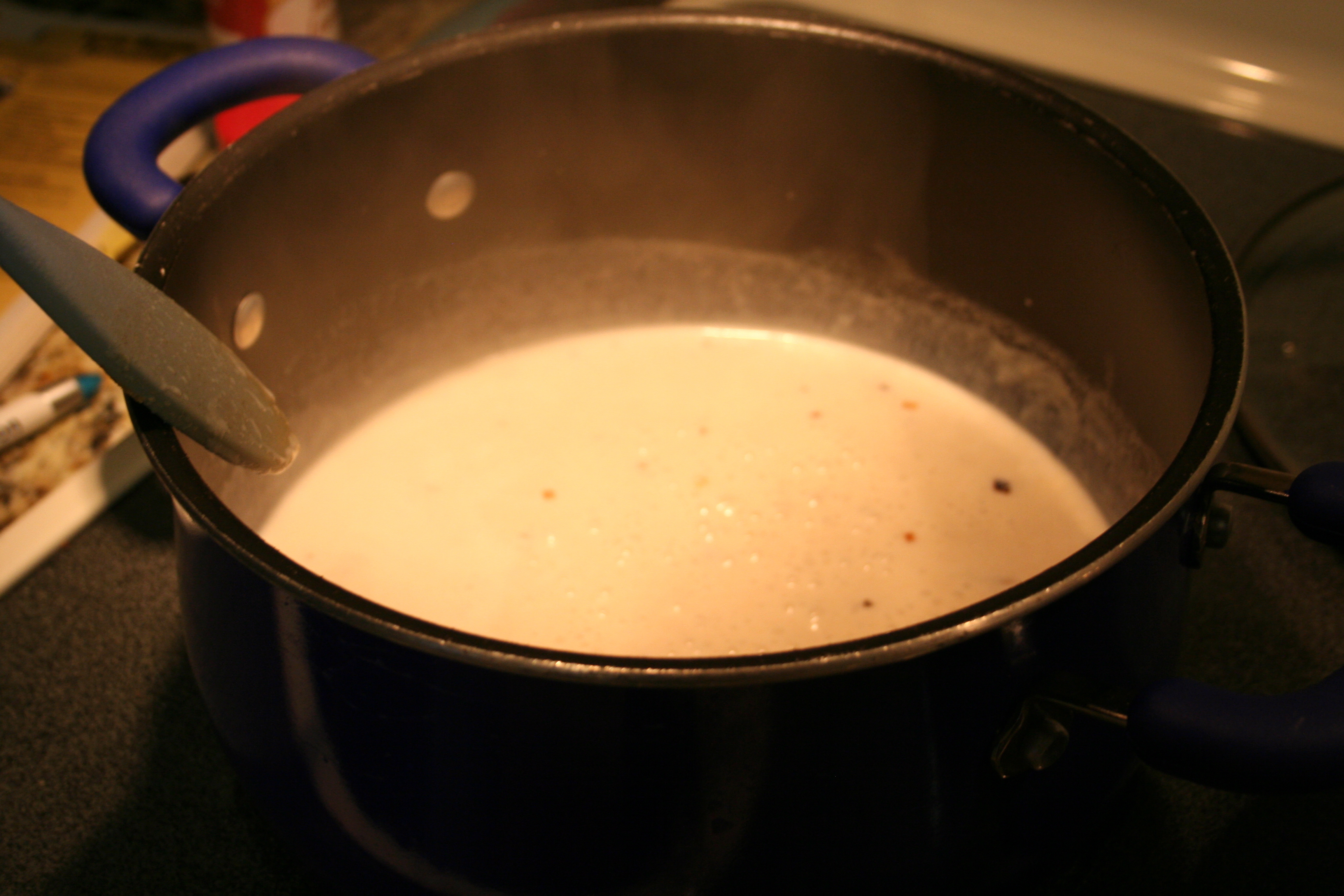 Mix the milk and flour together until they are smooth and then add to the garlic and butter. Increase heat to high cooking and stirring until it is bubbly and thickened.