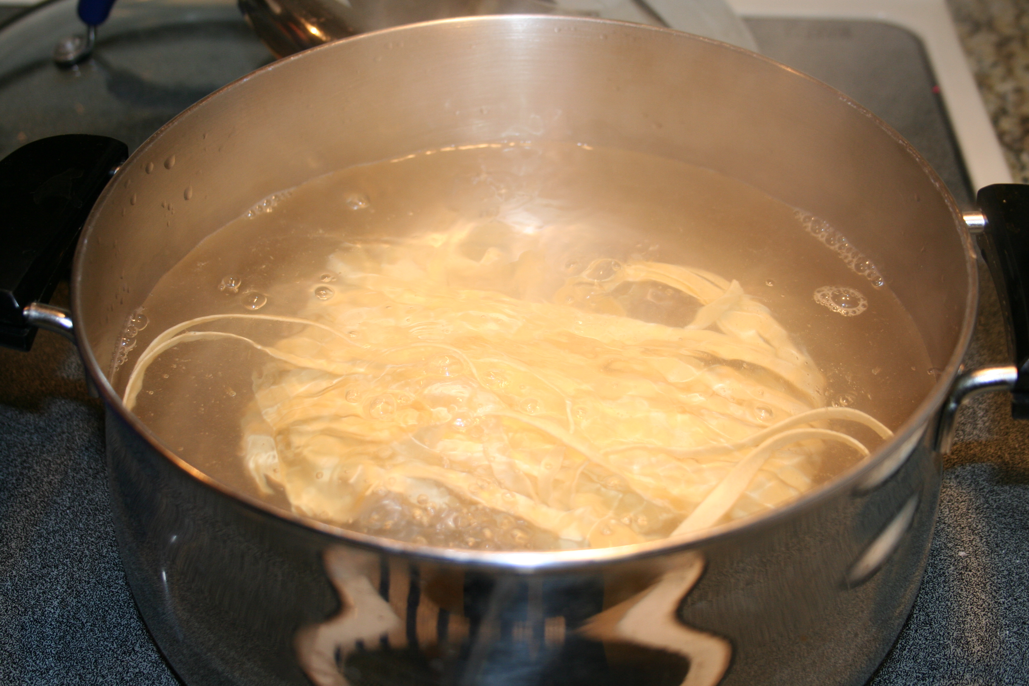In a separate pot, cook/heat the fettuccine in boiling water until tender.
