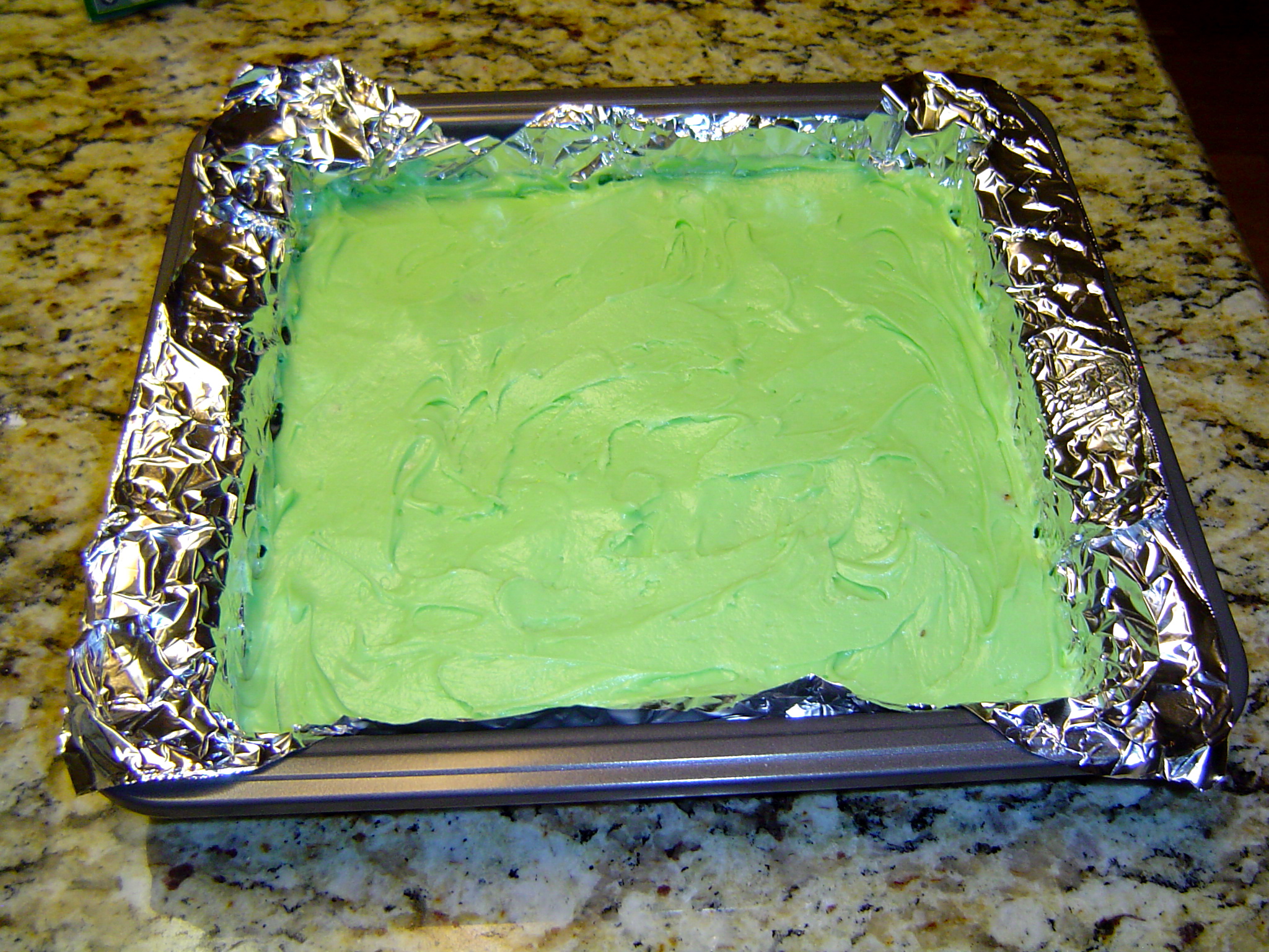 Top Layer: Once second layer is well-cooled, melt chocolate squares and butter for third layer in microwave. Make sure it is completely melted, mix well, and then pour onto second layer. I don't think I melted mine enough so it ended up going on a bit like icing. Refrigerate for several hours.