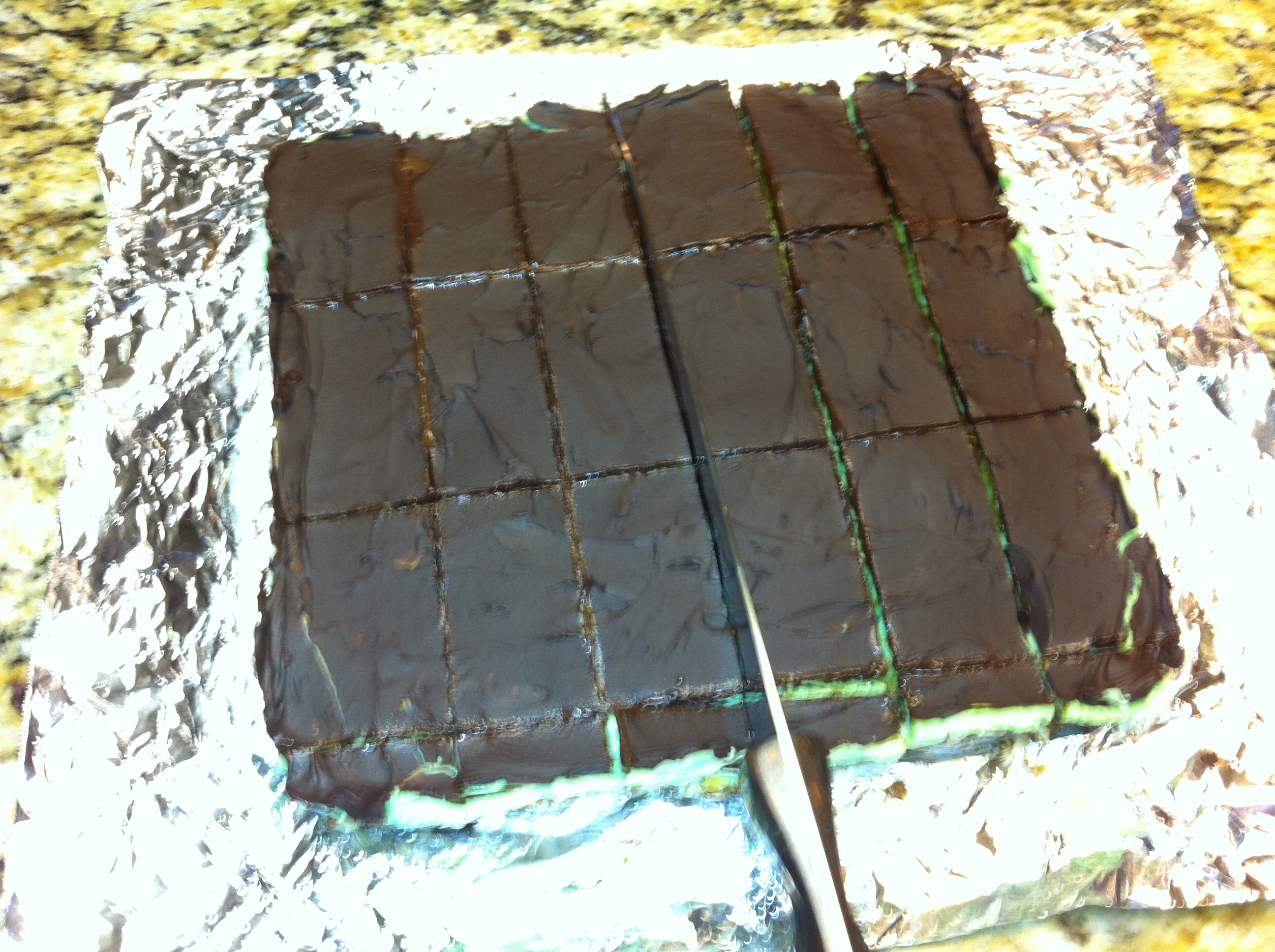Press into 9 x 9" pan lined with tin foil (the tin foil will be important later--be sure it is folded over on two sides as you'll use this to remove the bars later). As an alternative to cooking the egg and chocolate mixture on the stove you could just mix the above ingredients, press into pan and bake for 8 minutes at 350 degrees. Refrigerate until cool.